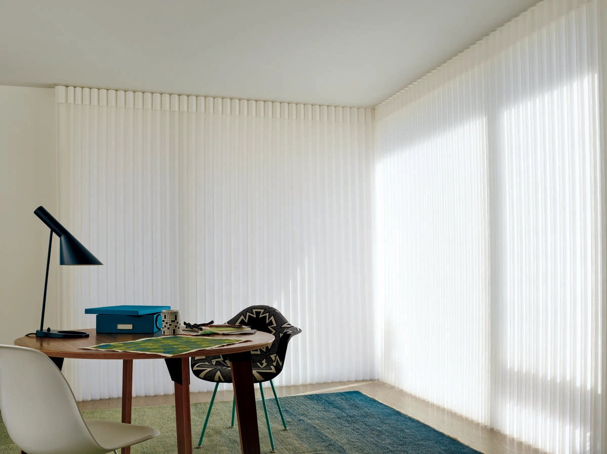 Our Skyline® Gliding Window Panels are a part of our sleek vertical blind collections. This particular collection is ideal for expansive windows and doors where the view is the star of the room. The panels stack nice and tightly when open for beautifully unobstructed views. When they’re closed, you’ll have plenty of privacy, and you’ll have lovely fabric and textures as your view. Our gliding window panels have an extensive collection of fabrics; Choose from over 600 colors that vary in texture, color, openness, and opacity.